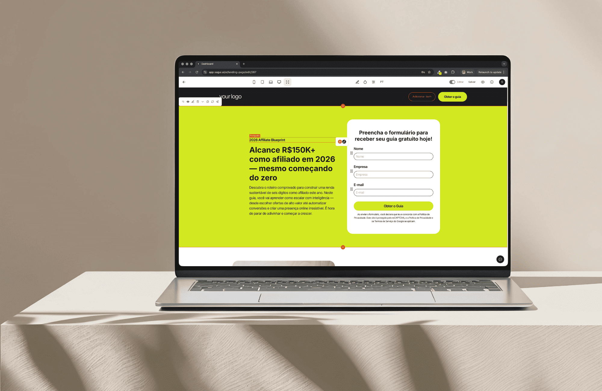 Crie, personalize e publique páginas de conversão em minutos. Use IA, escolha um modelo pronto ou comece do zero.